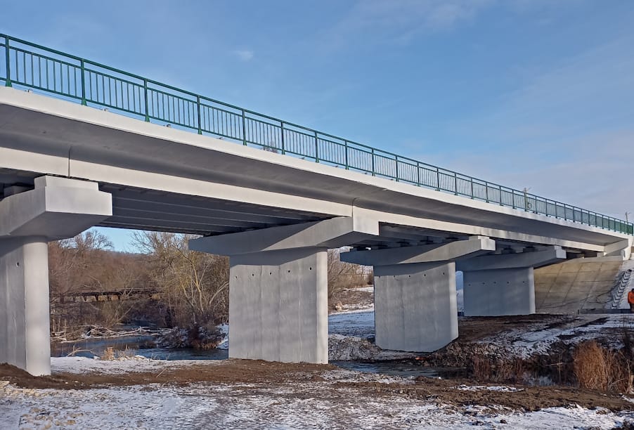 Протяженность объекта ― 65 пог. м. Специалисты обновили и укрепили опоры, заново забетонировали ригели, усилили пролетные строения монолитной плитой, уложили гидроизоляцию и дорожное покрытие. Мост стал выше примерно на полметра, поэтому переделать пришлось и подходы к нему. Продольный профиль дороги стал более ровным.